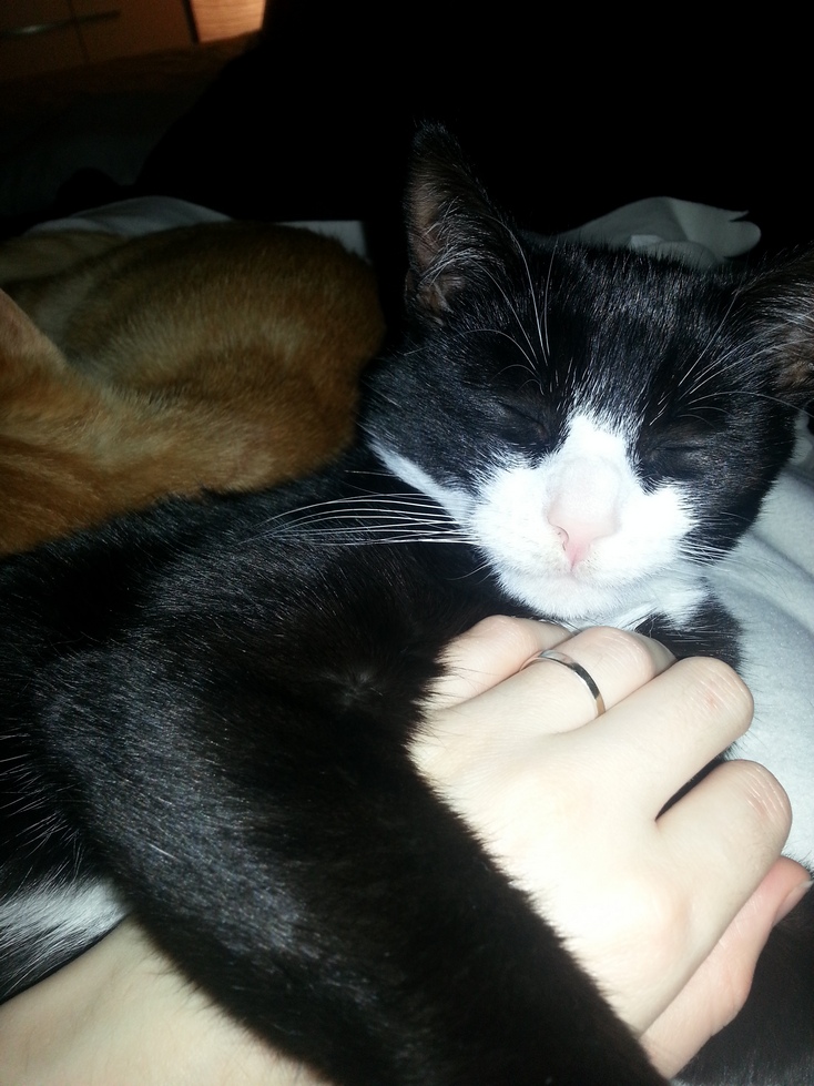 Doch es heißt nicht umsonst: Nicht der Mensch sucht sich seine Katze aus, sondern umgekehrt. So schaute mich Linus mit einem traurigen Blick an, der mich einfach nicht losließ. Und irgendwie hatte ich das Gefühl, dass er vielleicht gestreichelt werden wollte. Seine Geschwister fauchten und auch Linus selber reagierte noch sehr zaghaft, wich ganz leicht zurück. Doch dann entspannte er sich und fing nach einer Weile sogar an zu schnurren. Er stand auf, tapste umher, drehte sich immer wieder und ließ sich ganz offensichtlich gern von allen Seiten kraulen.