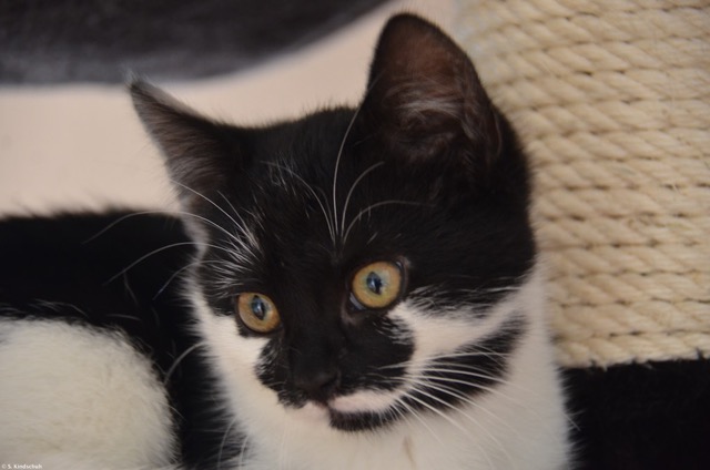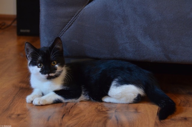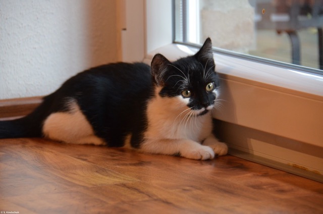 Sie sind sicher schon gespannt, zu hören, wie es Clarabelle bei uns gefällt. Sie ist erstmal in der Küche eingezogen, damit sie Ruhe fand und sich ein wenig eingewöhnen konnte. Nach dem aufregenden Umzug hat sie am Dienstag erstmal nicht wirklich fressen wollen, dafür hat sie aber seit Mittwoch Morgen immer guten Appetit. Im Moment füttere ich noch in getrennten Räumen, damit alle in Ruhe erstmal fressen. Ansonsten hat sie aber Mittwoch gleich durch lautes Miauen klar gemacht, dass vom Rest der Familie getrennt wohnen doof ist und seit dem darf sie so langsam alles hier erobern. Zwischendurch lasse ich sie immer nochmal ein wenig allein in der Küche, damit alle ausruhen können, aber die Zeiträume werden immer kleiner. Die „Tanten“ sind noch nicht vollständig begeistert, vor allem, weil der kleine Quirl gerne mal blitzschnell auf sie zu rennt und spielen will, aber außer lautem Fauchen zum „Bremsen“ passiert nichts. Ein bisschen Erziehung von den beiden Großen wird halt sein müssen, damit alle wissen, was o.k. ist und was nicht. Sie ist aber sehr pfiffig, interessiert sich für alles, was sich bewegt (heute hat sie den Bodenfeudel „entdeckt“) und wird sicher eine prima Hausgenossin. Beim Spielen wird abwechselnd geschnurrt und gezwitschert, was ich sehr lustig finde.