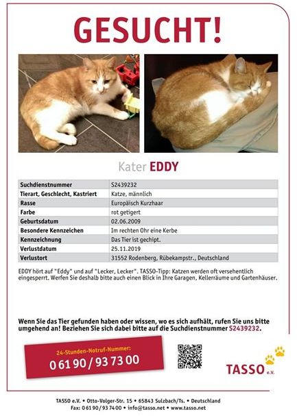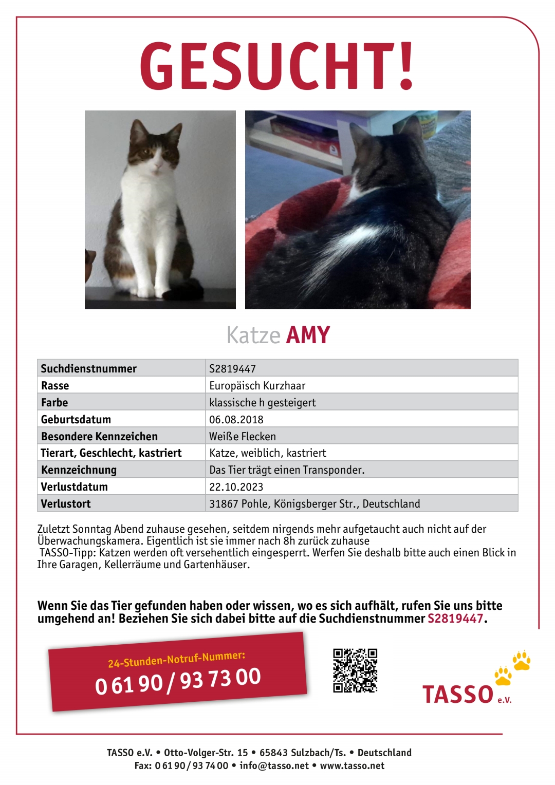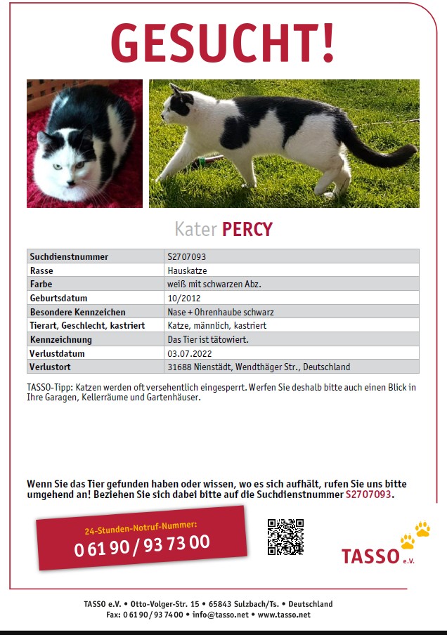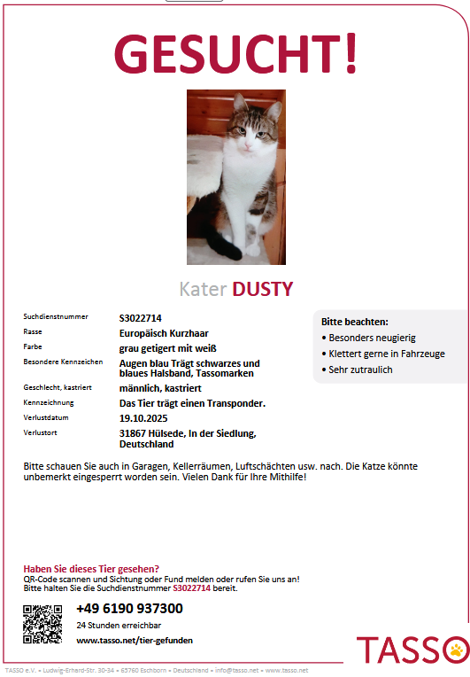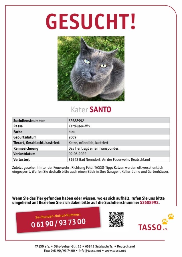 Diese Rubrik steht allen Tierhaltern offen, um ihre vermissten Schützlinge zu suchen. Wir veröffentlichen hier alle Vermisstenanzeigen, die uns per Mail - mit dem Einverständnis zur Veröffentlichung - zugeschickt werden. Dadurch ermöglichen wir dem Halter eines vermissten Tieres eine breitere Öffentlichkeit, zum anderen können auch die Finder eines Tieres hier nachsehen, ob das Fundtier von jemandem vermisst wird.
