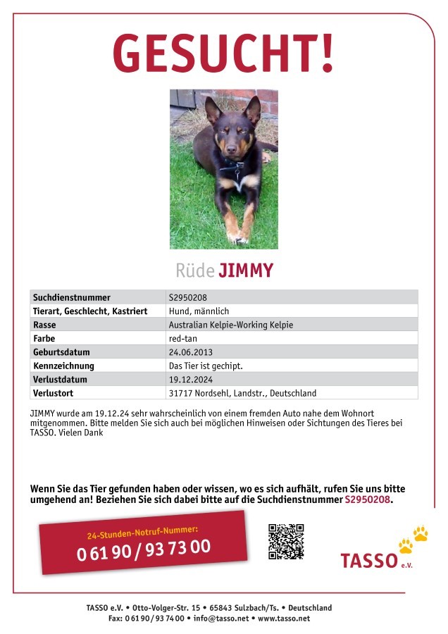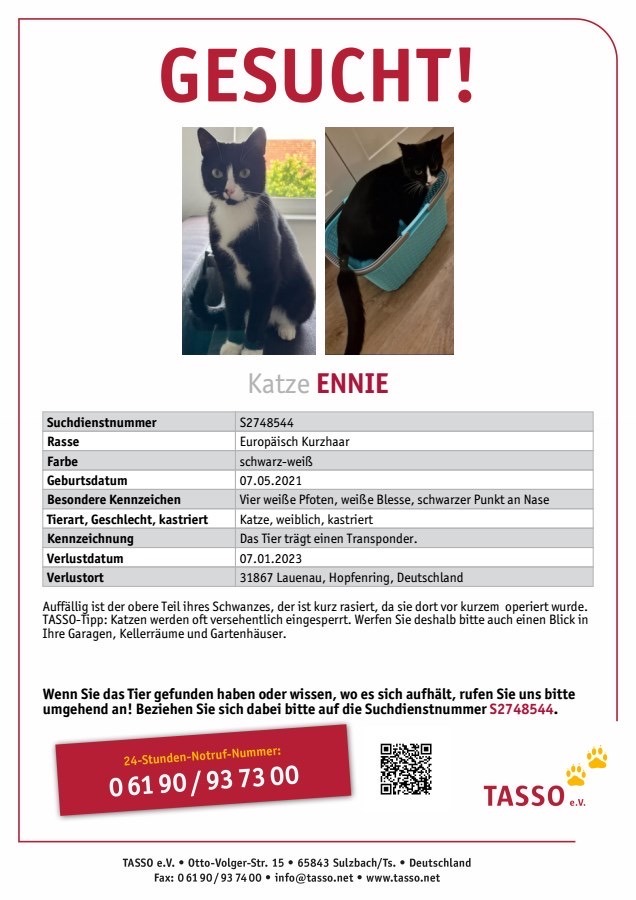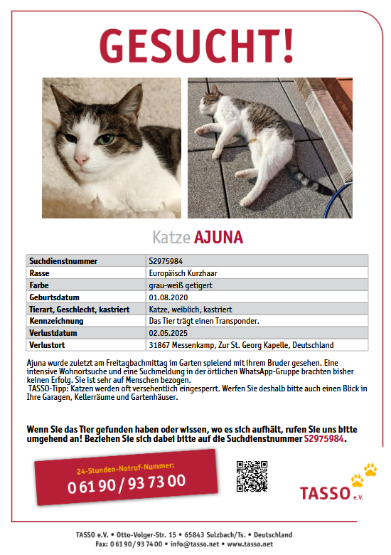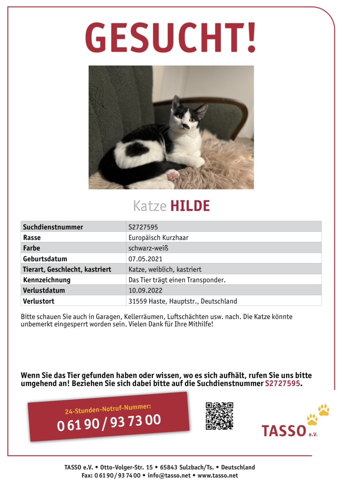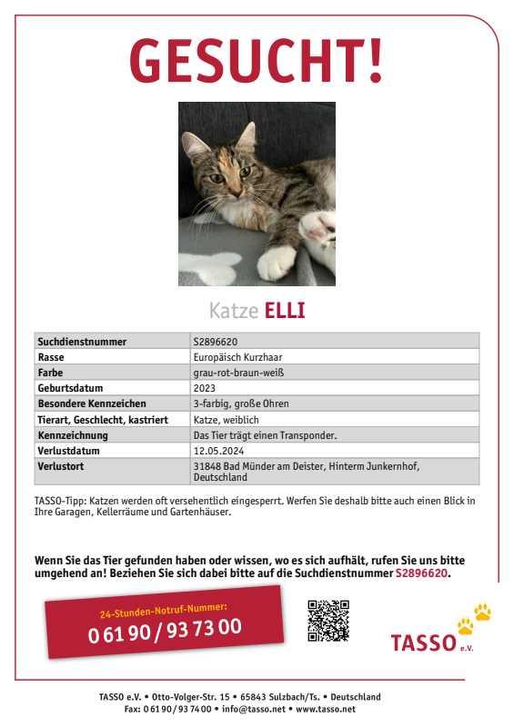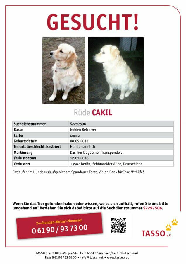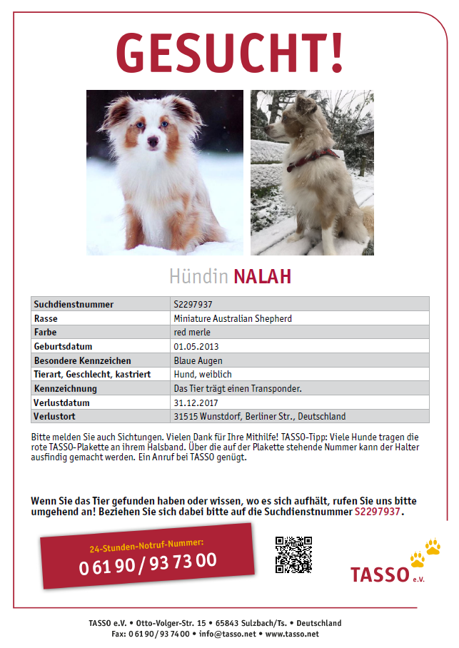 Tasso Suchdienstnummer S2326499 (aber nicht gechipt/tätowiert, Halsband hatte sie nicht an)