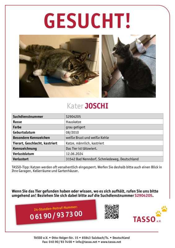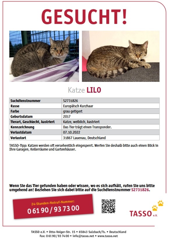 Wir vermissen unsere Katze Lotte seit dem 10. August. Sie hat ein schwarzgrau, getigertes Fell mit braunen Flecken und einer hellen Schwanzspitze. Lotte ist sterilisiert, jedoch nicht gechipt und nicht tätowiert. Lotte ist knapp 10 Jahre alt und wohnt in 31867 Lauenau.